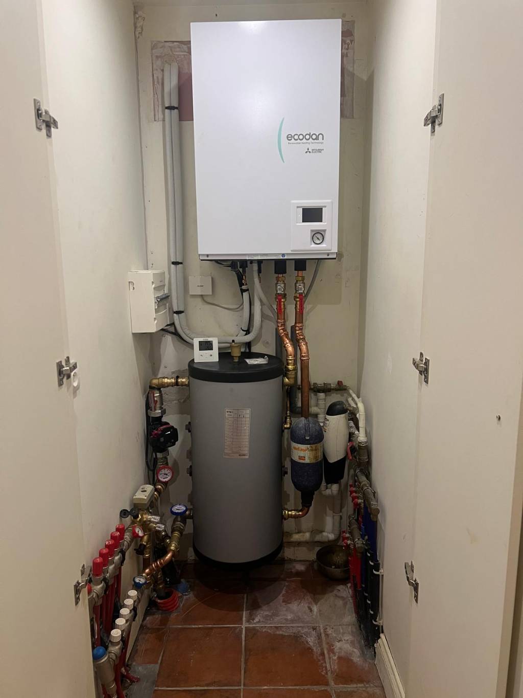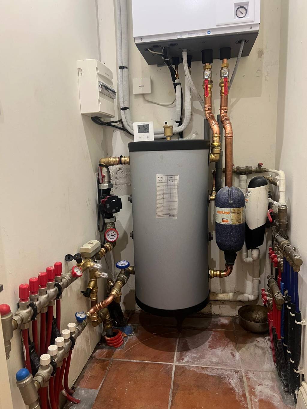 Après démontage et nettoyage de l'ensemble du réseau avec les produits de la marque COROXYL, nettoyant, désembouant et détartrant (C3). Nous avons mis en place une pompe à chaleur MITSUBISHI ELECTRIC modèle ZUBADAN SILENCE, technologie Japonaise avec maintien de puissance jusqu'à -15°C extérieur, l'ensemble comprend un groupe extérieur et un module hydraulique intérieur mural avec une régulation climatique avec appoint intégré.